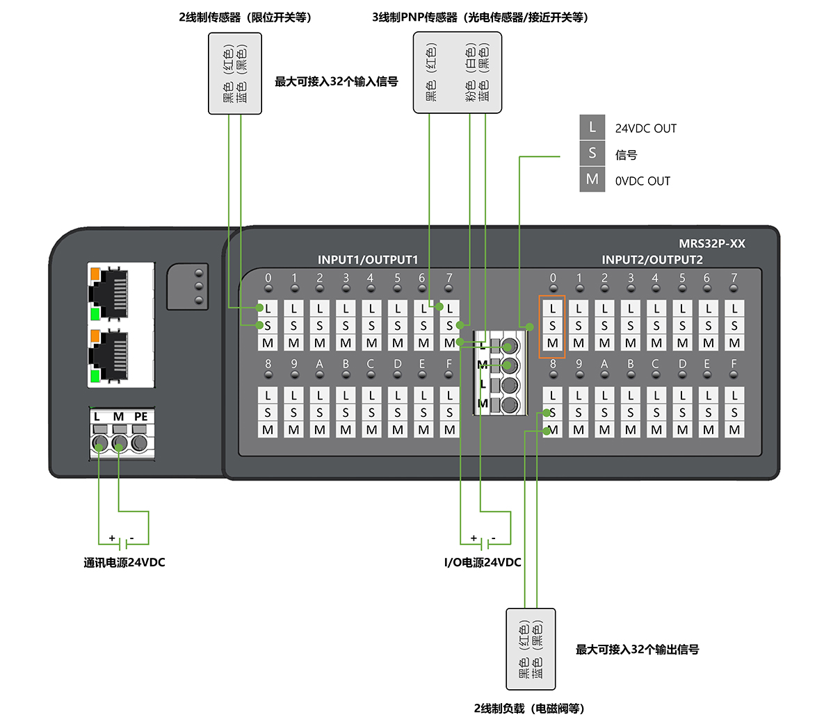 面板式快接線分布式I/O,PROFINET通訊,2xRJ45,可級(jí)聯(lián);PNP,32xDI/DO自適應(yīng),24VDC,單通道最大輸出0.5A,歐式彈簧端子;導(dǎo)軌安裝&打孔安裝(下單時(shí)需備注)