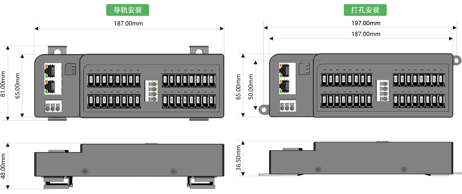 安裝方式:DIN35導軌安裝或雙側(cè)耳打孔安裝