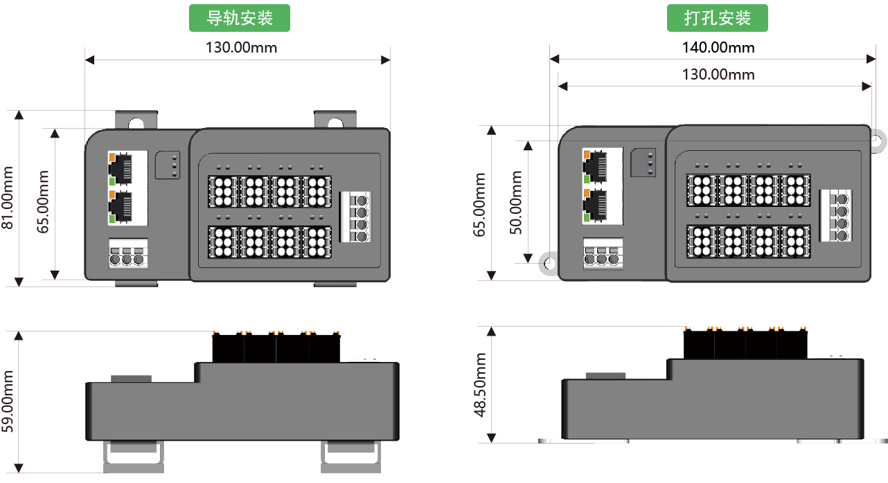 安裝方式:DIN35導(dǎo)軌安裝或雙側(cè)耳打孔安裝