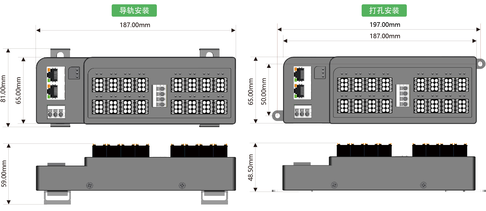 安裝方式:DIN35導(dǎo)軌安裝或雙側(cè)耳打孔安裝