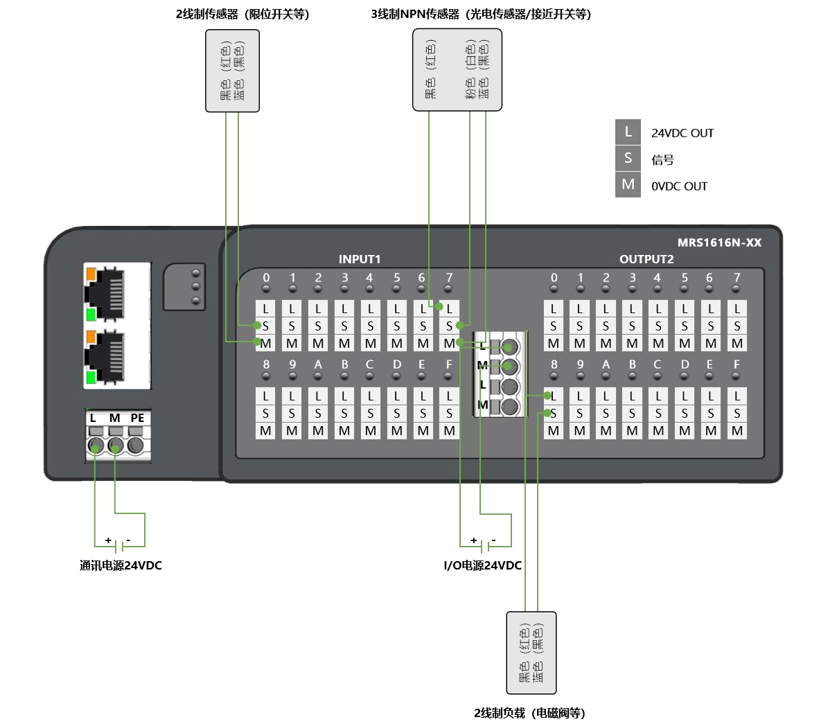 面板式快接線分布式I/O,EtherNet/IP通訊,2xRJ45,可級聯;數字量16入16出 NPN,24VDC,0.5A,歐式彈簧端子;導軌安裝&打孔安裝(下單時需備注)